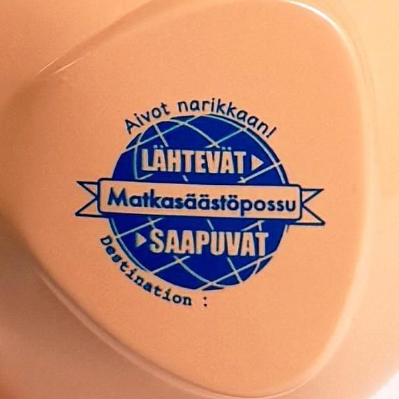 「Matkasäästöpossu(旅行基金)」の文字とともに、フィンランド独特の言い回し「Aivot narikkaan!(脳をハンガーラックに掛けよう)」が耳にプリントされ、