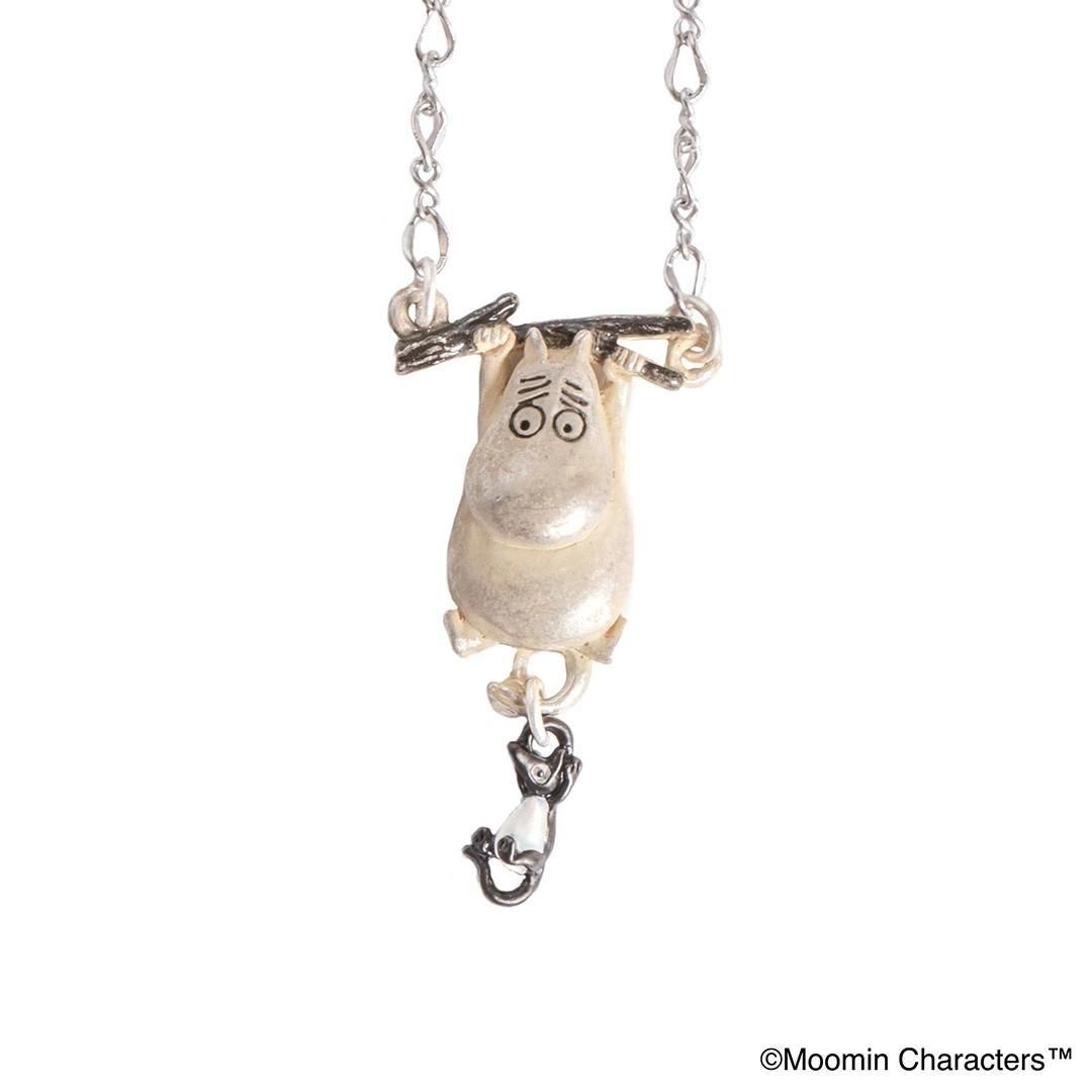 がんばって枝にしがみつくムーミンと、ムーミンの尻尾にねずみのソフスが掴まっているシーンをデザインしたネックレス。